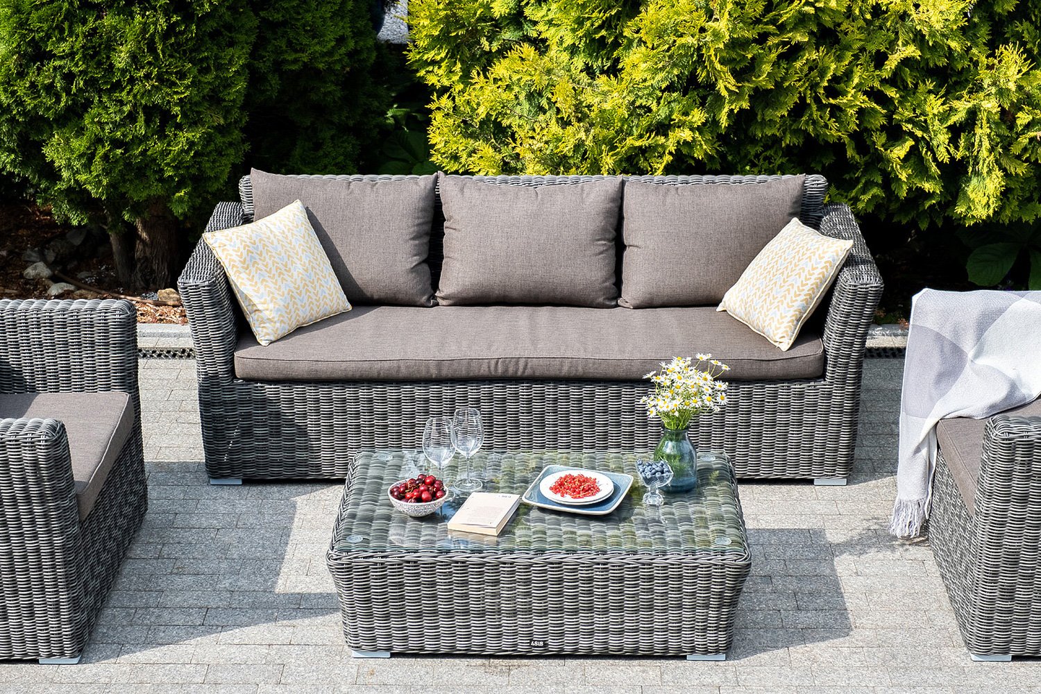 Диван капучино занимает пространство 170х81.5х86.5 см, и выполнен из современных материалов, которые позволяют ему выдерживать различные погодные условия. Цвет оплетки дивана – бежевый, и, хоть это и классический и привлекательный цвет, диван Капучино был бы не настолько красивым и комфортным без подушек, которые идут в его комплекте.